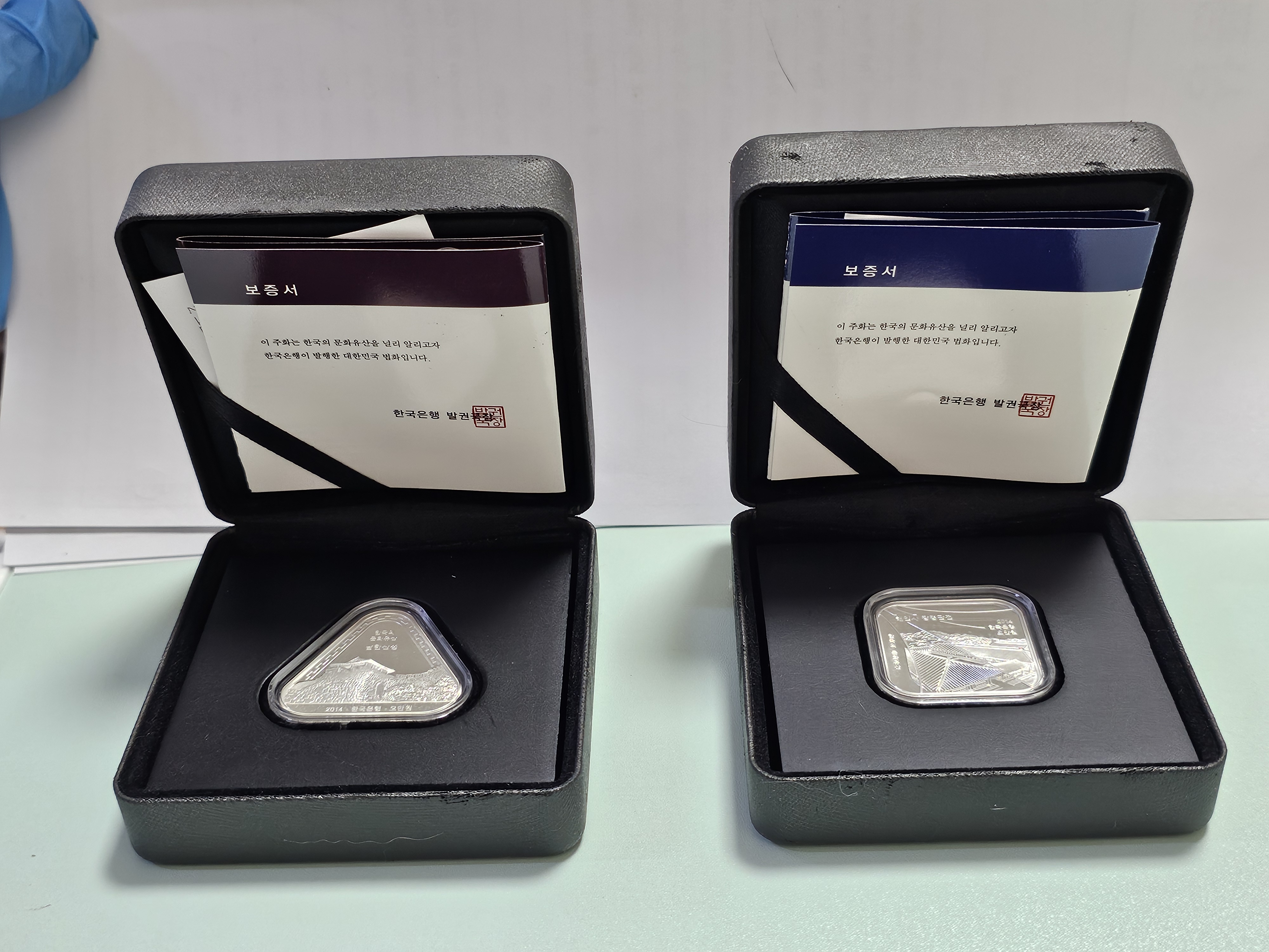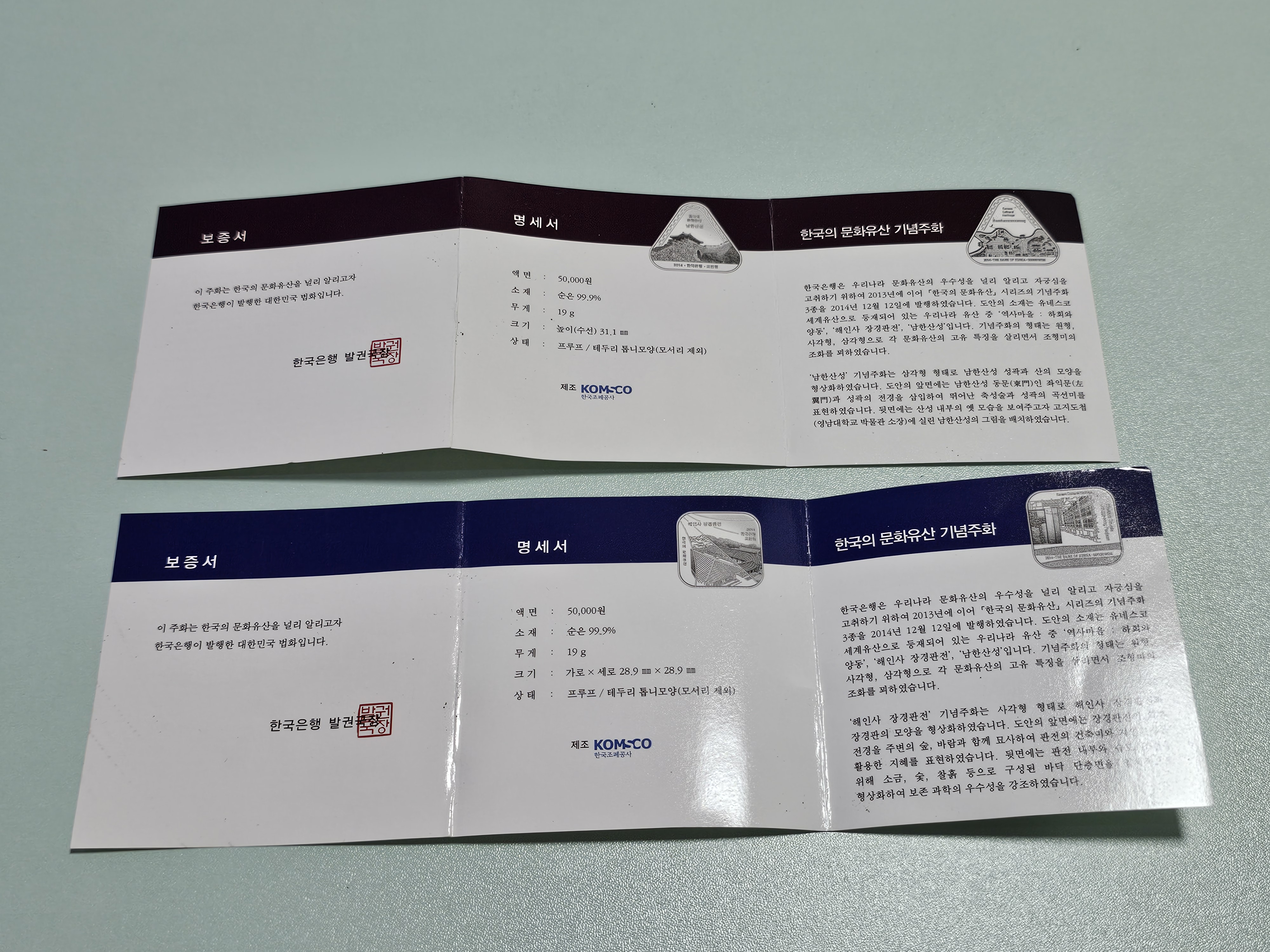 2014년 한국의 문화유산 해인사 장경판전 / 남한산성 은화 우리나라 최초의 사각형 / 삼각형 주화 다소 박스가 찐덕 거림.