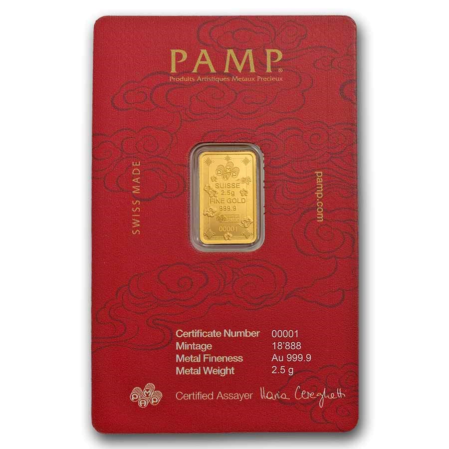 2.5 gram Gold Bar - PAMP Suisse Lucky Cat - (In Assay, Sleeve)