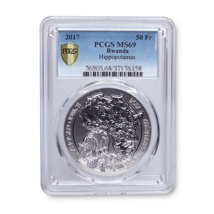 - Obverse: Features an African hippopotamus mother with her calf and the continent of Africa arching over the animals. The inscriptions "African Ounce", “2017” and the purity are listed along the rim.
