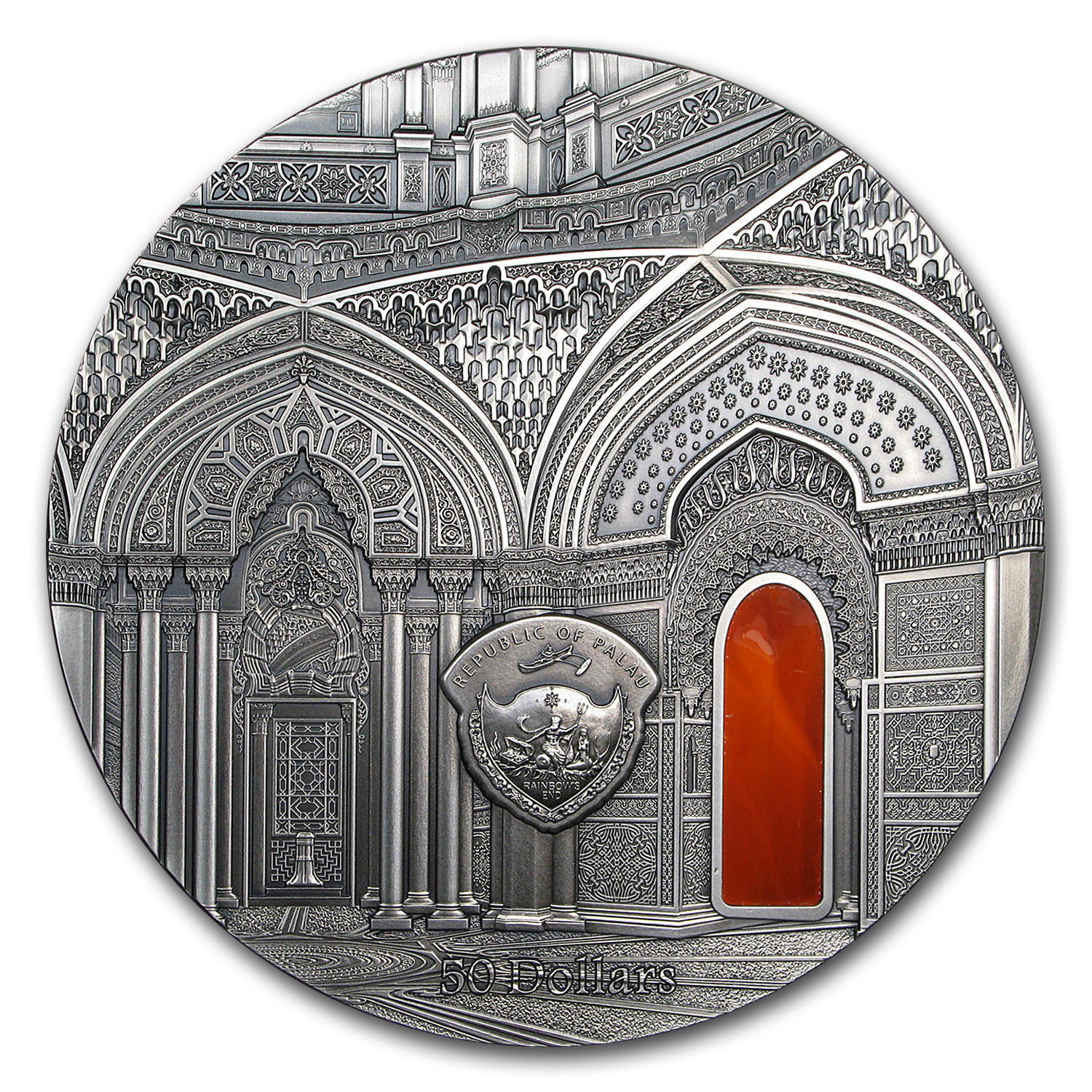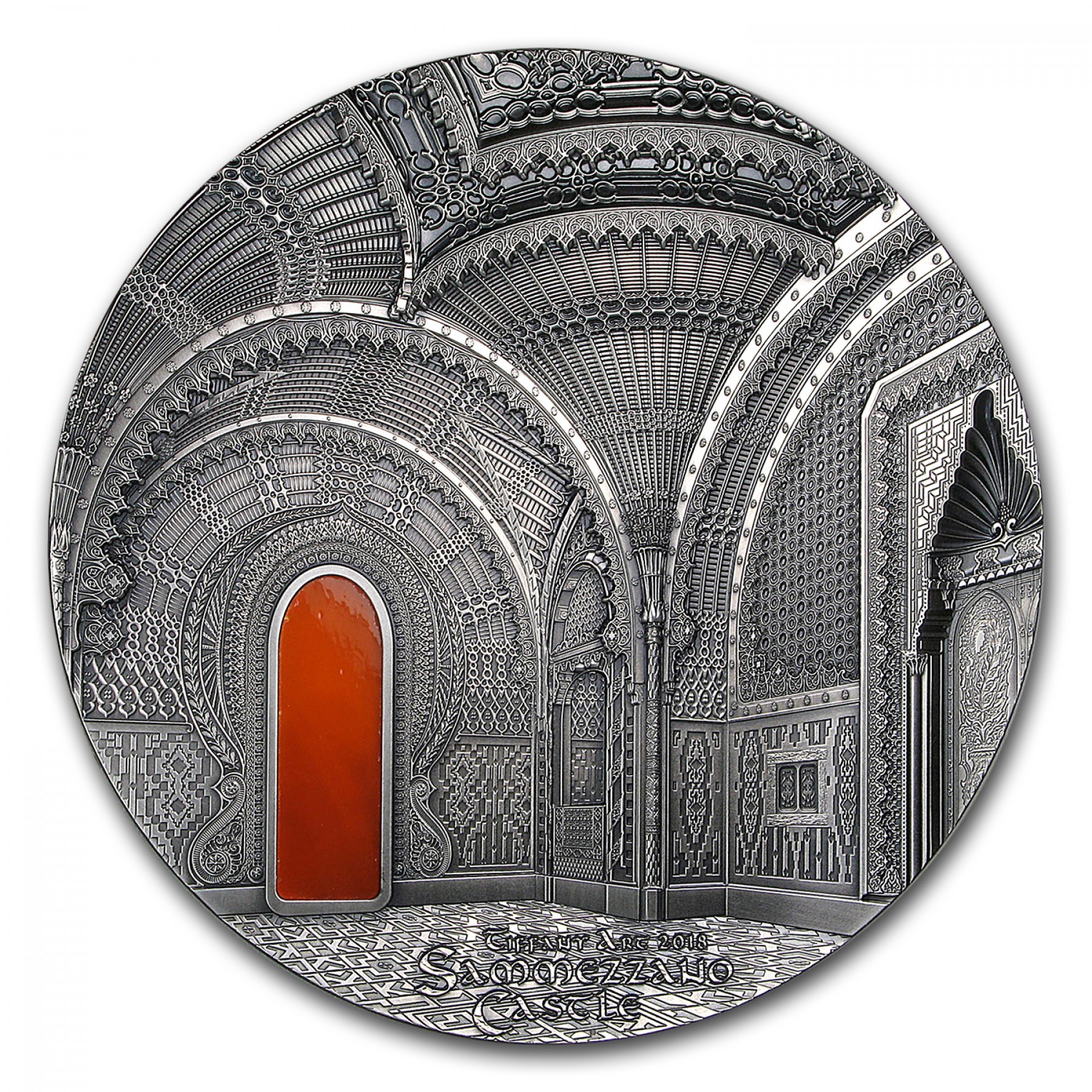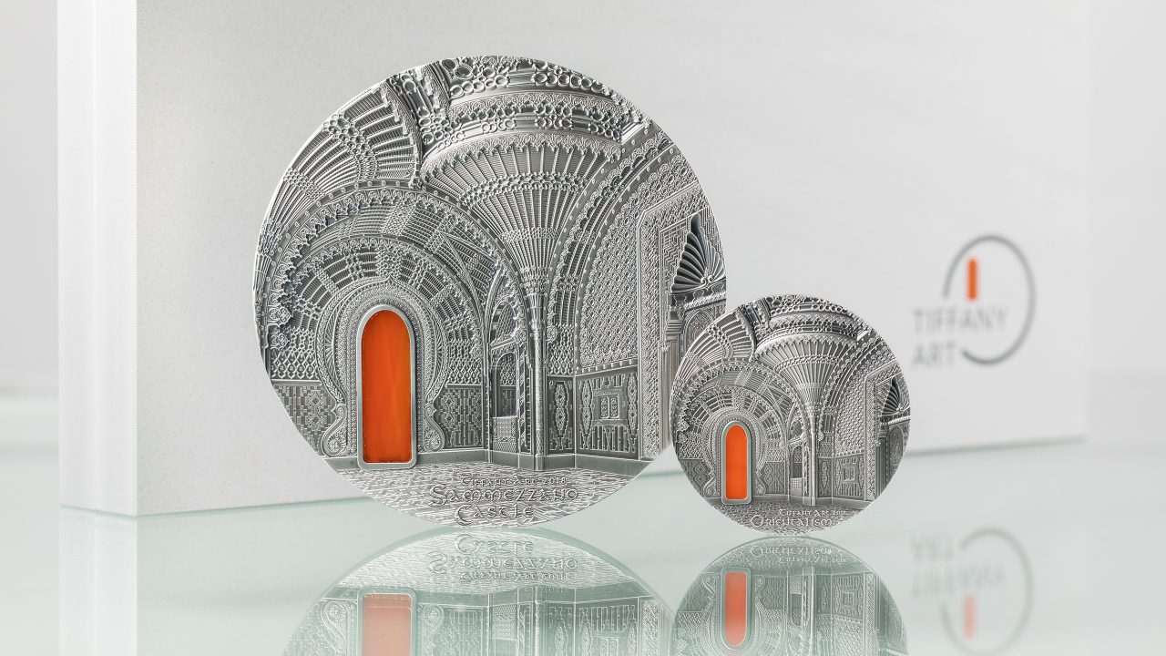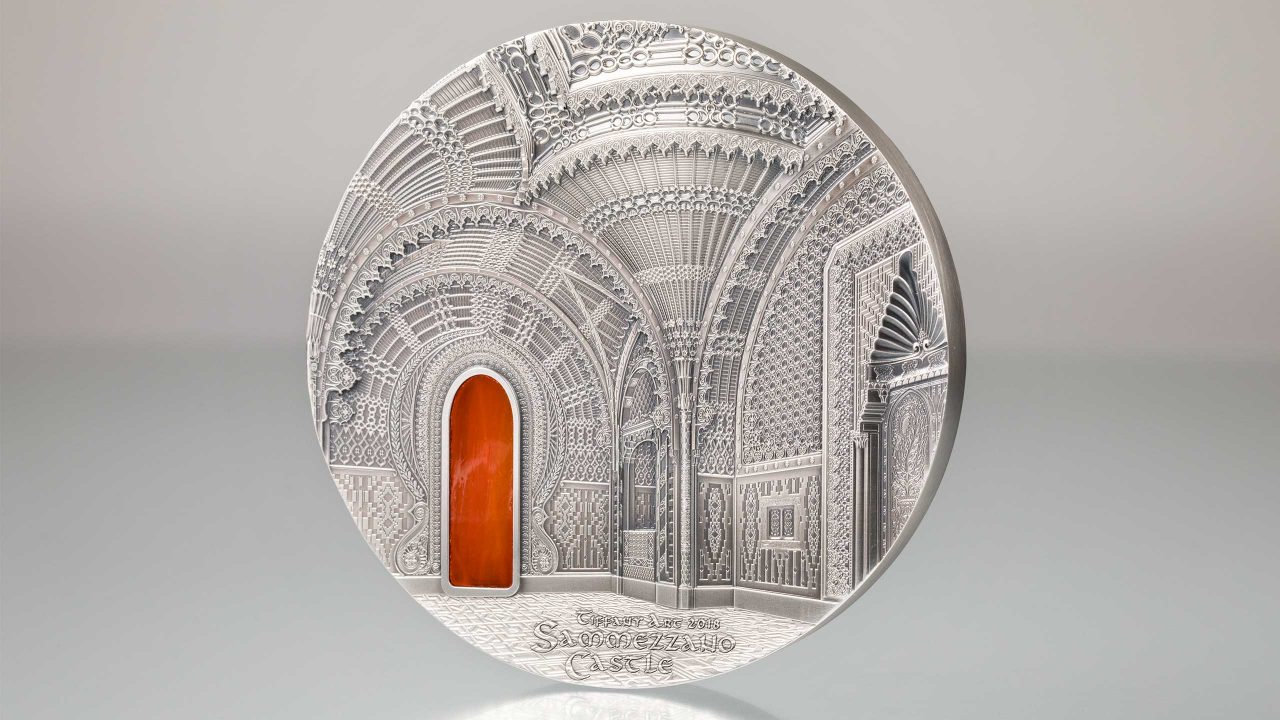 카스텔로 디 사메자노, 토스카나는 역사가 16세기로 올라가는 매우 독특한 주택입니다. 현재의 생김새는 100년후 동양학에 매료된 공작이 주택을 구입 후 변형시킨 것입니다. 이 성은 이탈리아와 유럽에서 만날 수 있는 가장 중요한 동양학의 본보기중 하나입니다. 세계2차 대전 이후에는 호텔로 사용되기도 하였던 이 건축물은 세계에서 가장 아름다운 10대 천장물을 보유한 건축물이기도 합니다. 코인의 앞면은 성에서 두번째로 자세한 방을 도안으로 사용했으며, 뒷면 또한 성의 내부 디자인 중 일부를 도안으로 사용했습니다. 이 코인은 티파니 아트 시리즈의 5번째 킬로 코인으로 오렌지색 색채 유리로 내부 인테리어가 강조되었습니다.