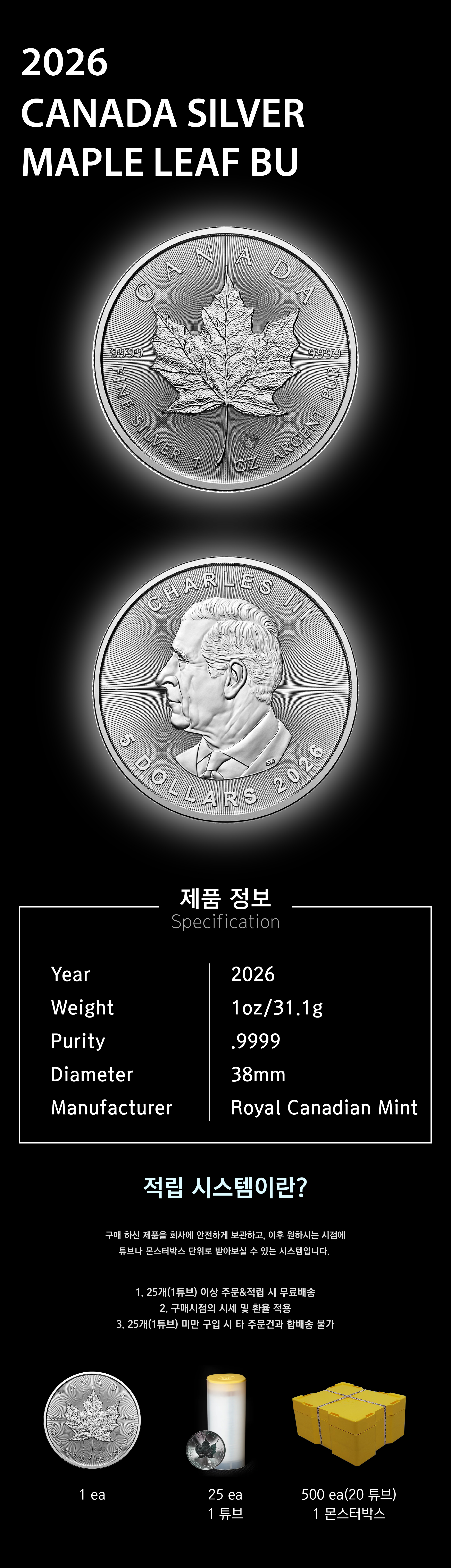 영업일 기준 배송 7-8주 소요 2026 Canada Maple 1 oz Silver Coin (31.1g)