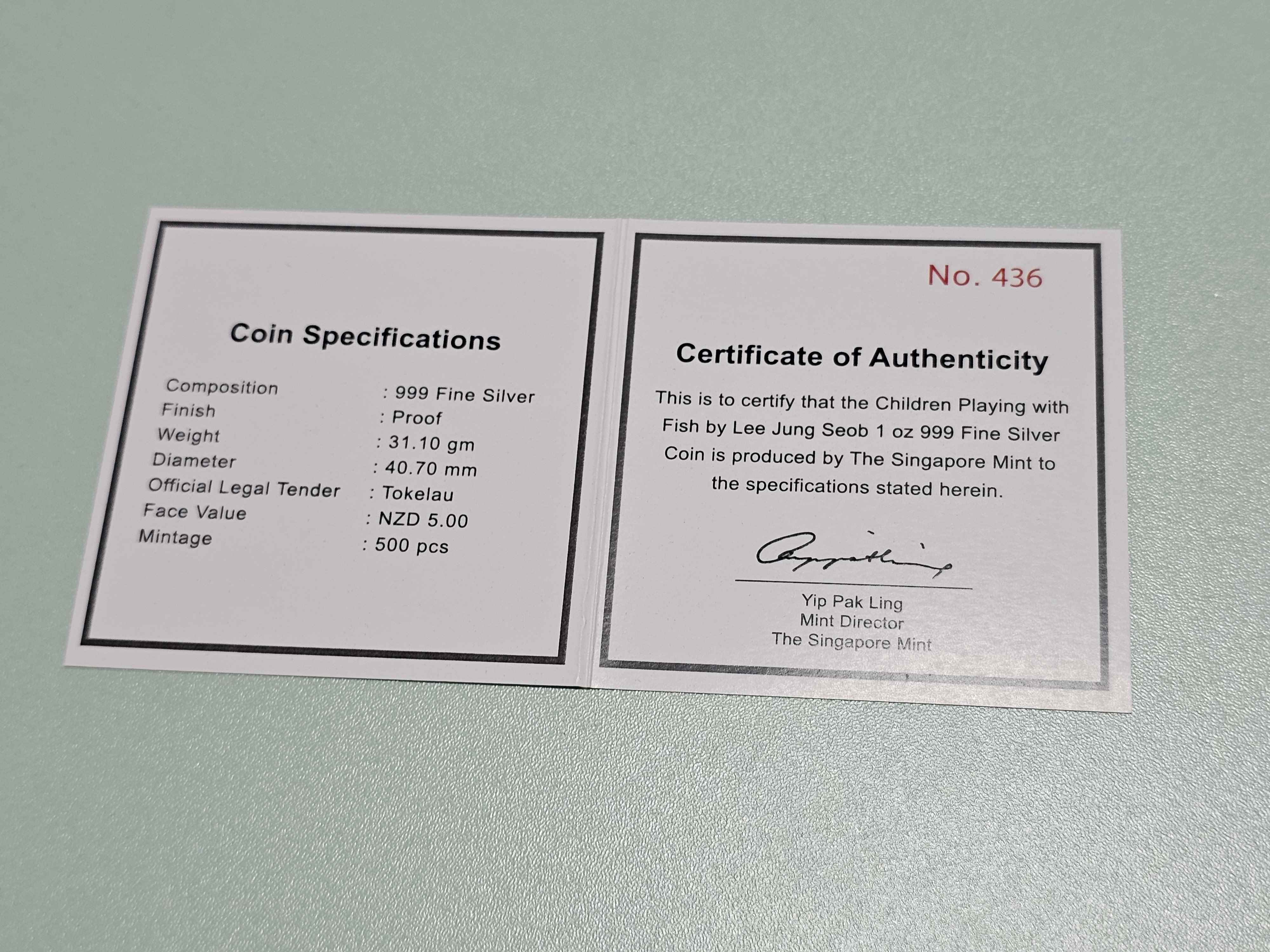 [위탁판매] 2021 Tokelau 1 OZ 999 Fine Silver Coin - Childen Playing with Fish by Lee Jung Seob