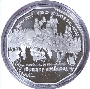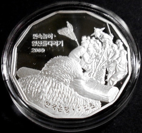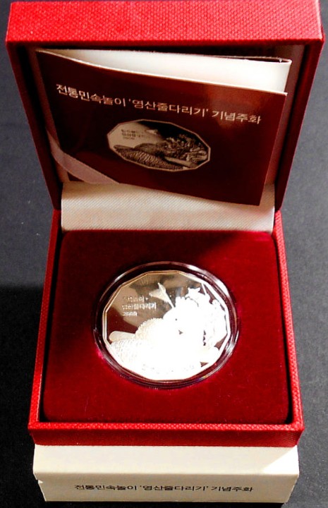 전통 민속놀이 시리즈의 세 번째 주화인 ‘영산줄다리기’는 2009년 10월에 발행되었다. 2007년 탈춤, 2008년 강강술래에 이어 영산 줄다리기를 주제로 하고 있읍니다. 영산줄다리기란 보름에 경상남도 창녕의 영산면에서 줄을 당겨 승부를 겨루는 편싸움 형식의 대동놀이이며, 영산의 대보름 축제에서 연행하던 줄다리기는 1930년대에 이르러 전승이 중단되었다가 광복 후(1949년)에 한 차례 옛 모습을 되찾는 듯했으나 6·25전쟁으로 종언을 고했읍니다. 근래에는, 국내 은화들의 움직임이 국제 은값의 상승과 함께 숨가쁘게 움직입니다. 국내 은화에 깊은 관심을 기우리면 좋은 결과가 나올 것으로 생각합니다. 줄투 하시기 바랍니다. (코인 림쪽에 토닝있음)