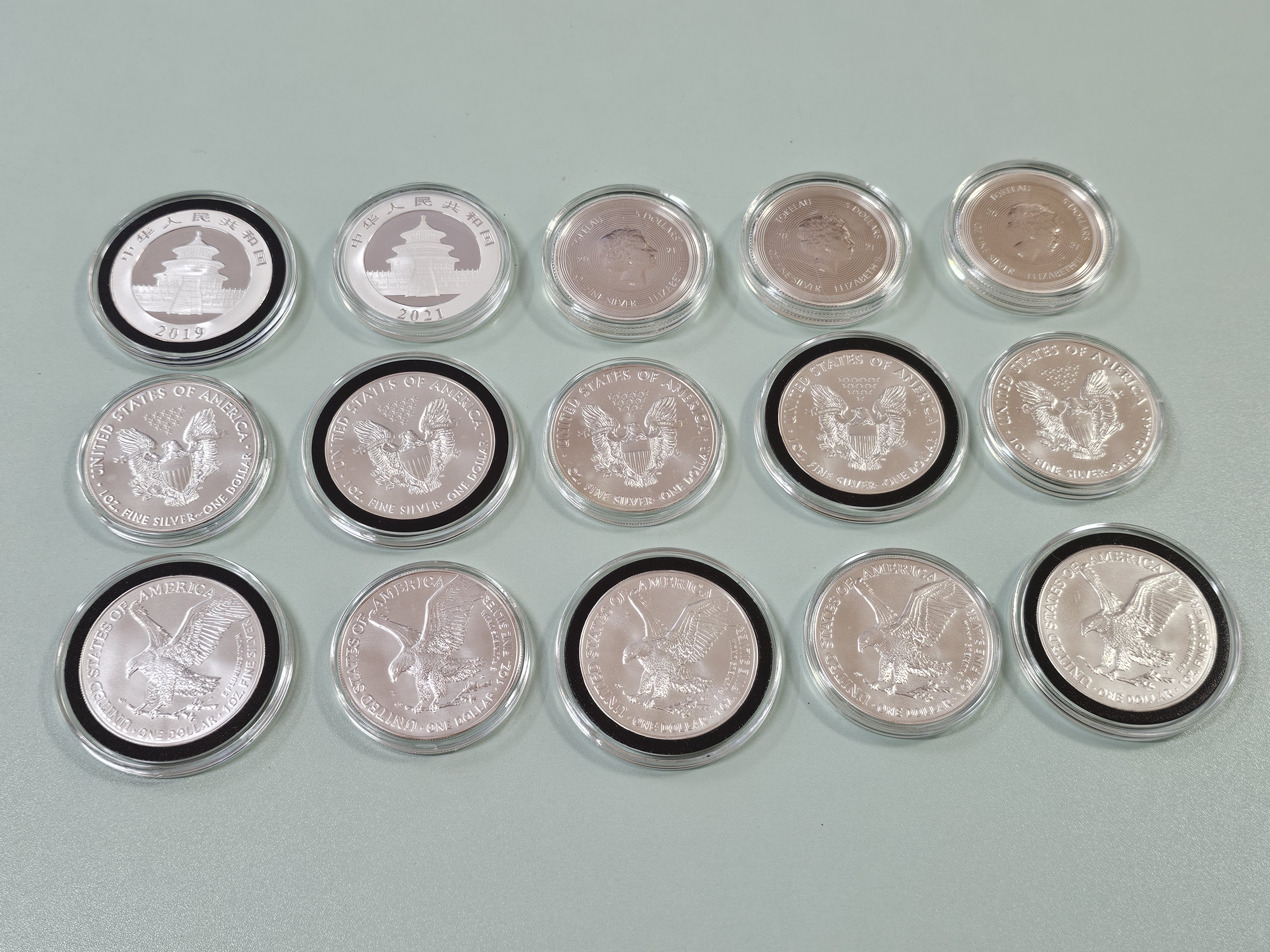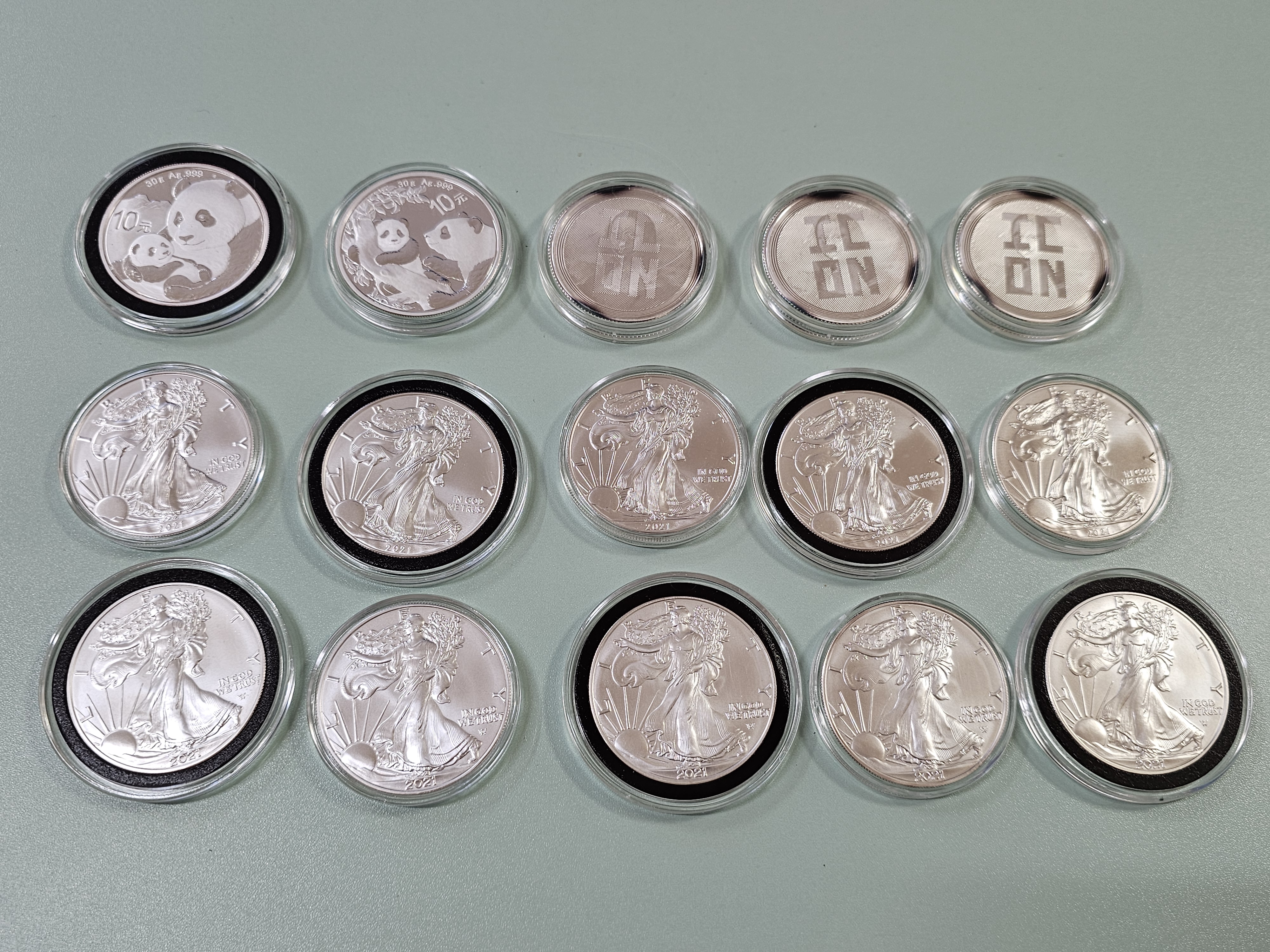 2018년 중국 ‘팬더’ 30g 은화 (1개) : 변색 2021년 30 gram China Panda 999 Silver Coin BU (1개) 2021 Tokelau 1 oz ICON Monalisa Optical Illusion Proof-Like Silver Coin (3개) : 변색 2021 1 oz American Silver Eagle BU (5개) : 구도안 2021 1 oz American Silver Eagle Coin (BU, Type 2) 7/15/2021 (5개) : 신도안 ※ 위탁 쇼핑몰에서 팬더나 이글 주화는 낱개 판매를 안받는 관계로 다른 주화(ICON)를 섞어서 15온스 묶음으로 판매합니다. ※ 테두리 검은색 코인은 에어타이트 폼링형 코인캡슐(미국산)에 넣은 것입니다.