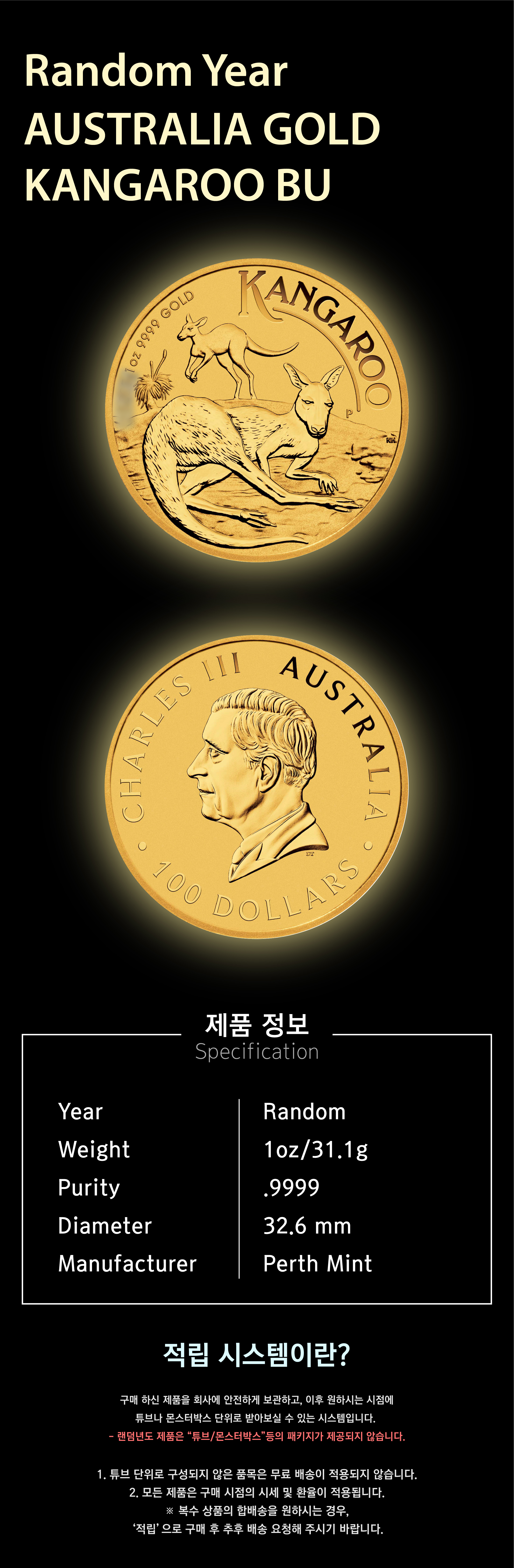 영업일 기준 배송 4-5주 소요 Random Year Australia 1 oz Gold Kangaroo BU