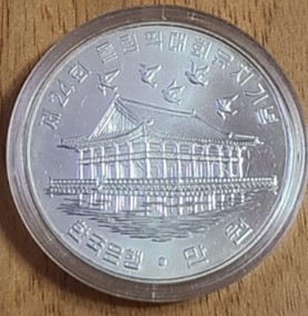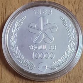 1982년 제24회 올림픽대회 유치 기념은화 중 경회루가 앞면에 새겨진 만원권 은화는 1983년 8월 1일 발행된 기념주화로, 경복궁 경회루와 그 위를 나는 비둘기 다섯 마리가 도안으로 사용되었고, 서울올림픽 유치를 기념하고 올림픽 지원자금을 마련하기 위해 발행된 주화입니다. 이 은화는 한국 전통 건축물과 평화의 상징을 결합해, 올림픽 개최의 의미와 민족적 자부심을 동시에 표현한 기념품입니다. 여태까지의 느린 가격 움직임으로 인해, 상승한 은화 가격도 아직까지 원소재+제작비에도 못 미치는 것으로 판단되며, 앞으로도 충분한 상승 여력을 가지고 있다고 생각하고 있습니다. 국내 은화들의 움직임도 국제 은값의 상승과 함께 하루하루 숨가쁘게 움직입니다. 국내 은화에 깊은 관심을 기우리면 좋은 결과가 나올 것으로 생각합니다. 줄투 하시기 바랍니다. (미세 스팟있습니다)