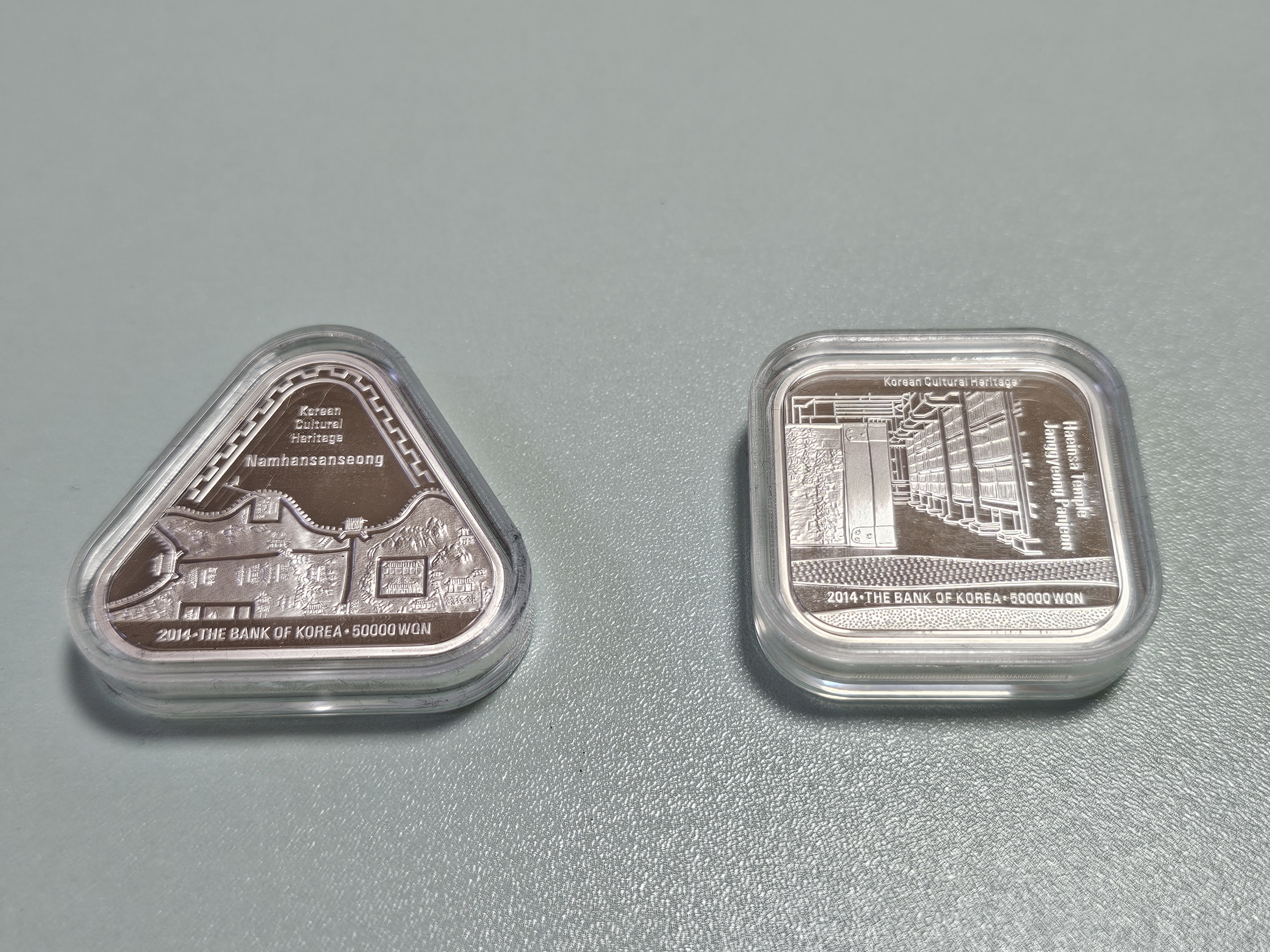 2014년 한국의 문화유산 해인사 장경판전 / 남한산성 은화 우리나라 최초의 사각형 / 삼각형 주화 다소 박스가 찐덕 거림.