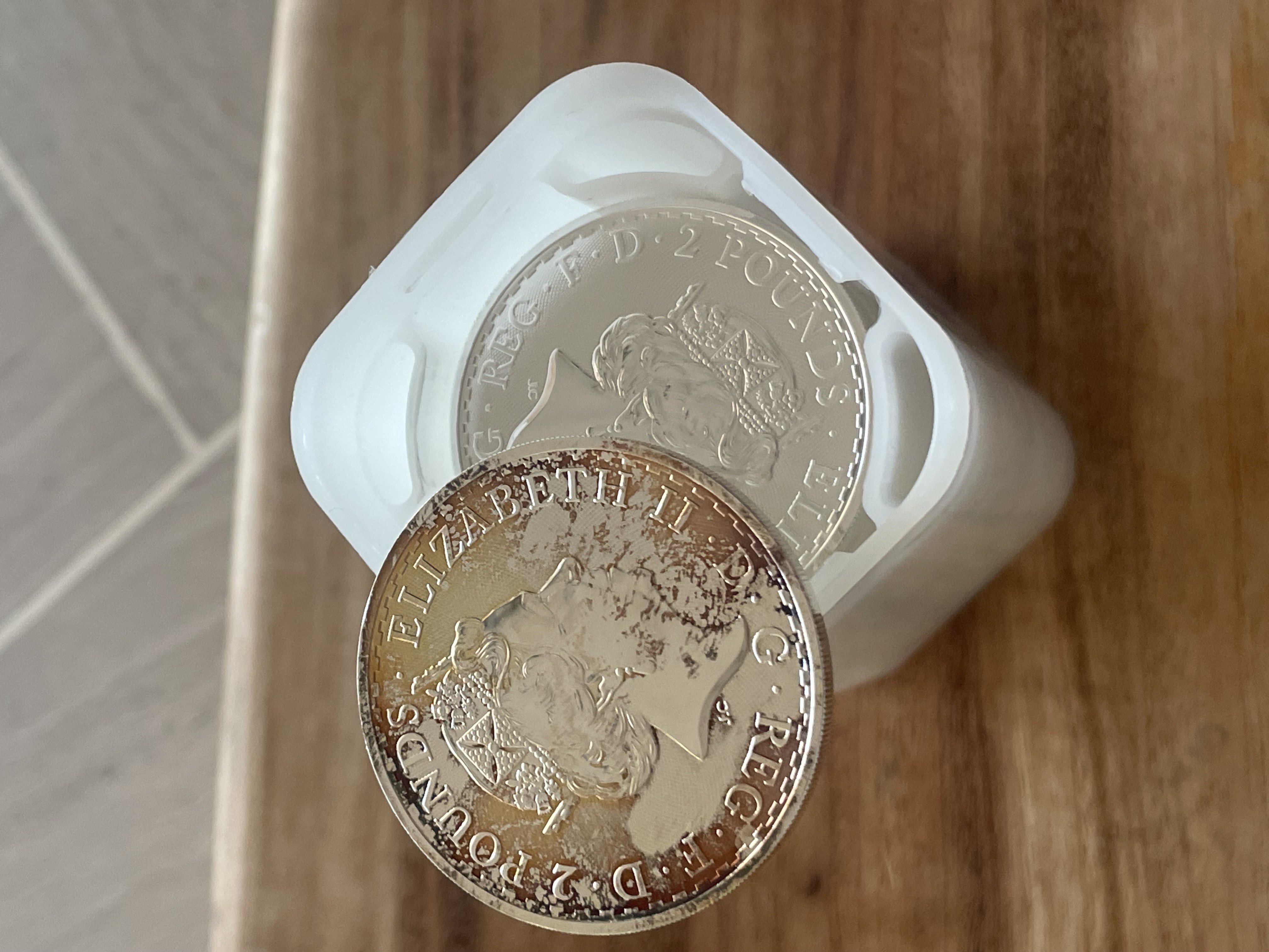 튜브 25개 코인중 가장 상단에 위치한 코인1개의 전면 색상이 부분적으로 구리빛으로 변색됨 (후면 및 나머지 24개 은화는 변색 없음)