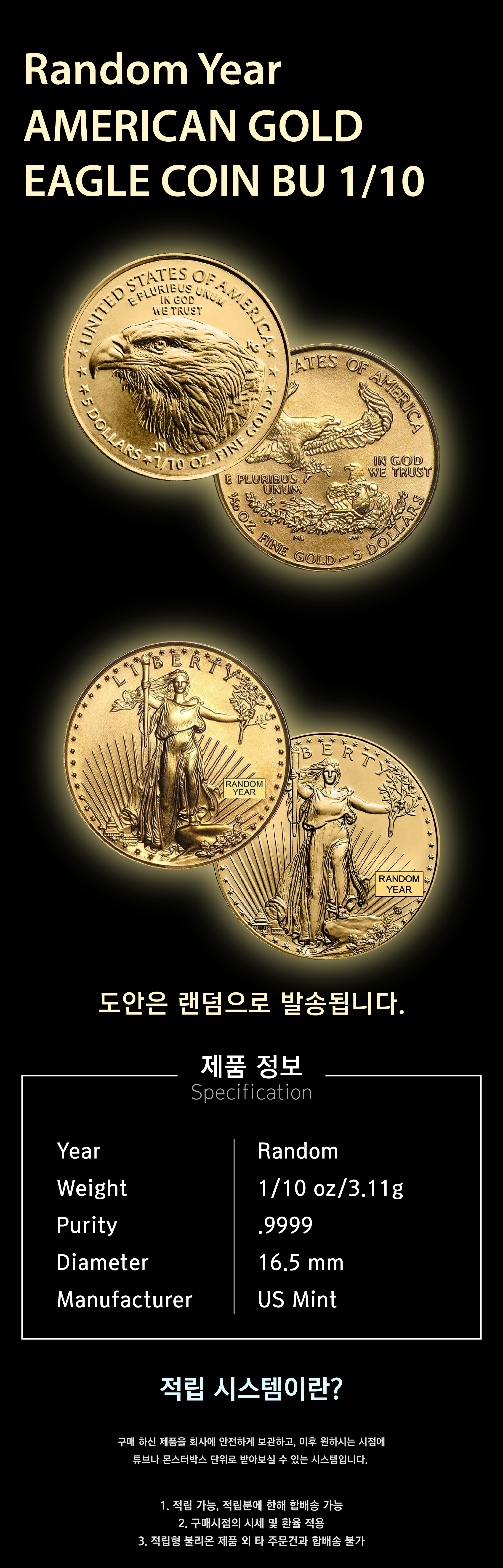 영업일 기준 배송 2-3주 소요 Random Year USA 1/10 oz Gold American Eagle BU