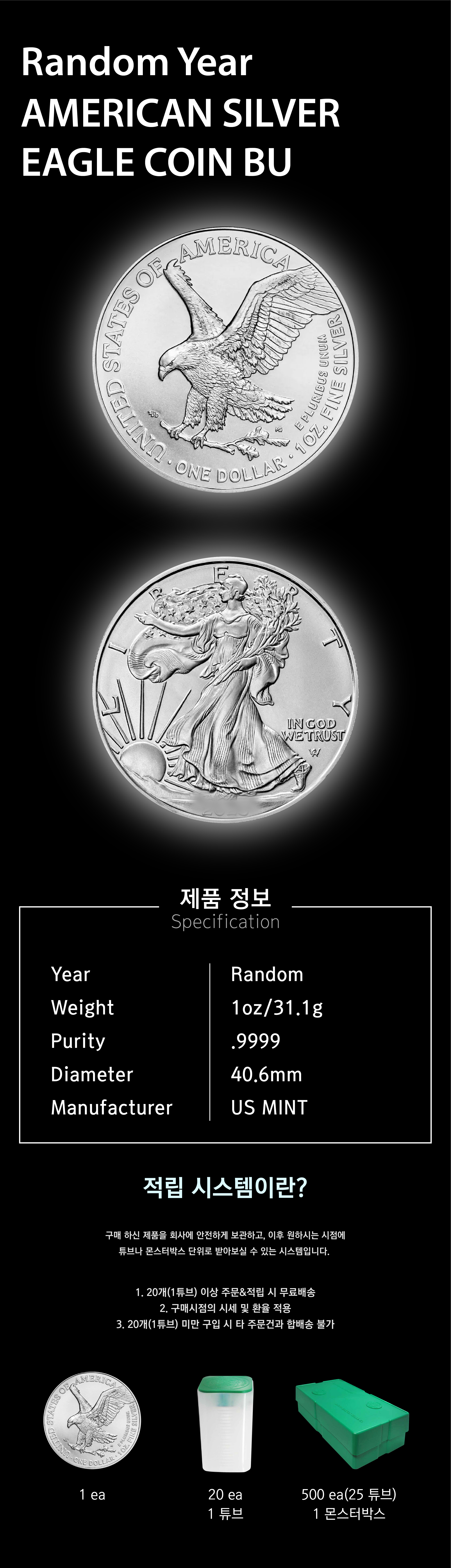 영업일 기준 배송 2-3주 소요 Random Year USA 1 oz Silver American Eagle BU