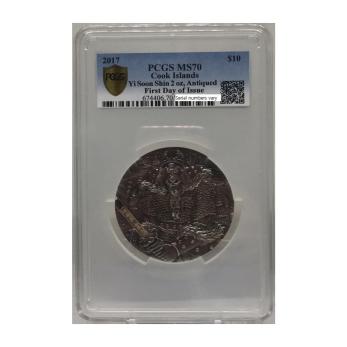 2017 Cook Is Yi Soon Shin 2oz Silver Antiqued Coin FIRST DAY OF ISSUE PCGS MS70